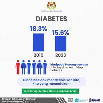 Prevalen diabetis menurun daripada 18.3% (2019) kepada 15.6% (2023).