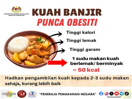 Setiap orang boleh menjadi obes jika dia tidak memilih diet yang seimbang dan aktiviti fizikal yang mencukupi. Ini dapat dilihat melalui pengambilan hidangan makanan bersama kuah. Kuah “banjir” merupakan salah satu faktor yang menyumbang kepada kegemukan atau obesiti. Ini disebabkan oleh, kuah terutamanya yang bersantan dan berminyak, bukan sahaja tinggi dengan lemak tetapi juga tinggi dengan garam dan kalori. Kuah yang berlemak/ berminyak/ manis akan menyebabkan pertambahan kalori yang tidak diperlukan oleh badan. Oleh itu, pengambilan kuah berlemak/ berminyak secara berlebihan sehingga banjir secara kerap boleh menyebabkan kenaikan berat badan dan seterusnya meningkatkan risiko obesiti. Untuk itu, hadkan pengambilan kuah banjir yang berlemak/ berminyak dan tukar kepada kuah yang ditumis atau sup sebagai alternatif yang lebih sihat.